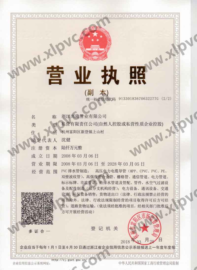 浙江興隆管業(yè)有限公司位于杭州市富陽區(qū)(杭州第九新區(qū)),坐落在新登鎮(zhèn),相距杭州僅60公里,水、陸、空交通運輸十分便利。浙江興隆管業(yè)有限公司前身為富陽興隆塑料制品廠,成立于1992年,2008年改名浙江興隆管業(yè)有限公司,數(shù)十年來,公司一直至力于管道的生產(chǎn),目前公司擁有國內(nèi)先進的CPVC保護管生產(chǎn)線,HPVC()雙壁波紋管生產(chǎn)線,多孔管生產(chǎn)線,玻璃鋼電纜保護管生產(chǎn)線、MPP電纜保護管生產(chǎn)線。生產(chǎn)的主要產(chǎn)品有:CPVC電纜保護管、MPP電力電纜保護管(頂管)、高強度塑合金管、HDPE給排水管、HPVC()雙壁波紋管、玻璃鋼電纜保護管、埋地通信用的PVC-U多孔管、PE直壁管、PVC-U雙壁波紋管、梅花管等,年生產(chǎn)能力達20000萬米。